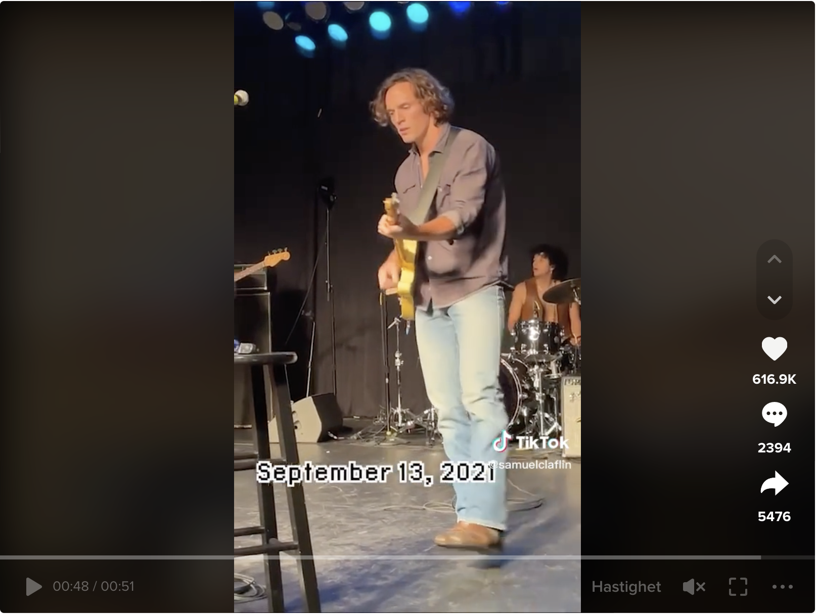 Överallt där detta diskuteras berörs det där numera mytiska gigget bandet hade inför inspelningsstarten, med filmcrewet och nära och kära som publik. Det måste ju finnas ett antal mobilinspelningar, varför dyker de inte upp? Jag hann bli skeptisk till hela storyn innan jag till slut upptäckte några sekunder som Claflin själv lagt upp på sitt Tiktok-konto. Jag hatar att länka till Tiktok, men nöden har ingen lag: