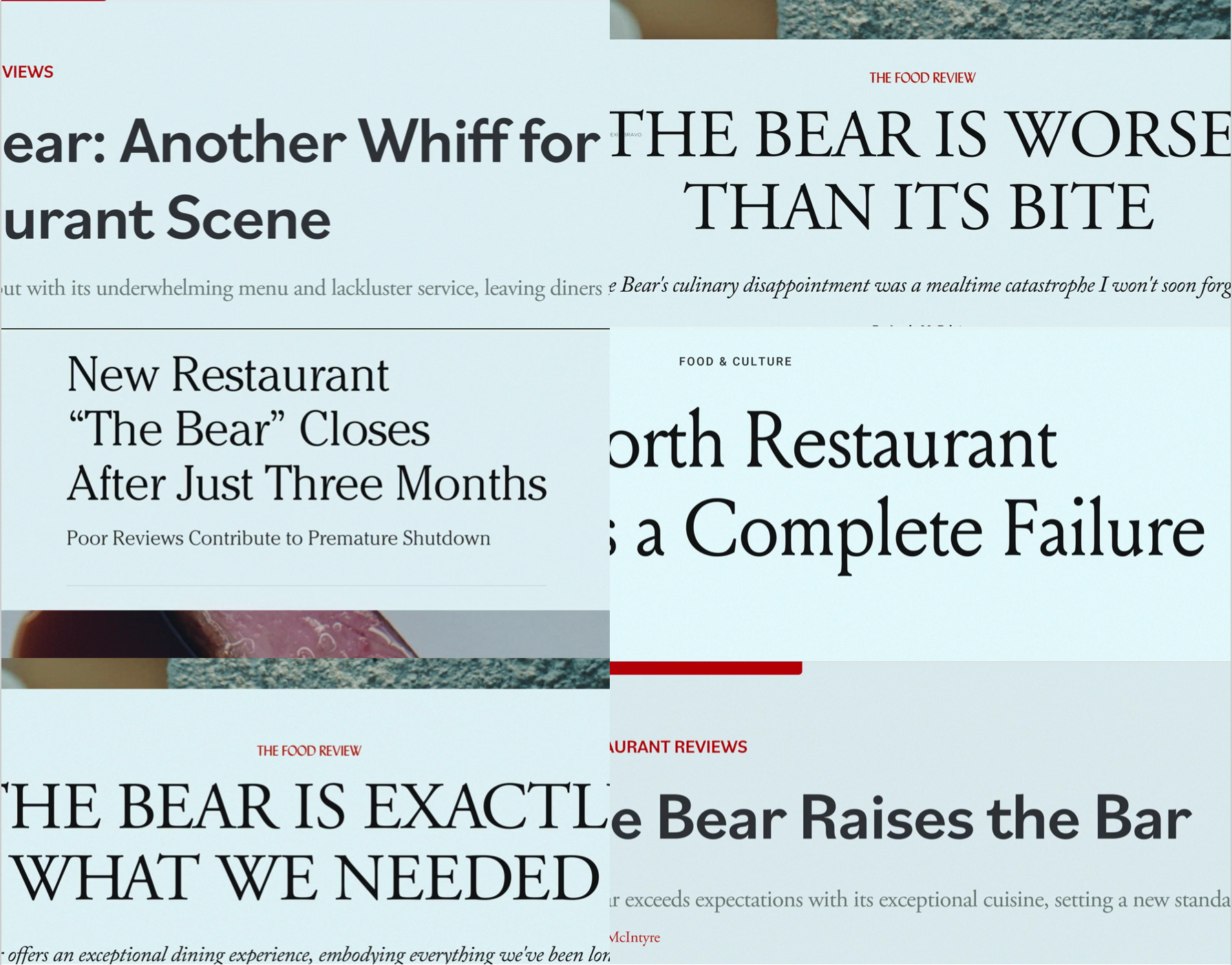 Men, varför skulle även Computer ringa som en vettvilling till Carmy på grund av en dålig recension? Varför inte låta Cicero sköta kontakten som vanligt? Nej, något annat verkar vara i görningen här. Och om vi också fryser bilderna med recensionsrubriker som klippts in sekundsnabbt under hela avsnittet (och som jag utgår ifrån inte är faktiska tidningsrubriker utan vad Carmy föreställer sig och oroar sig för; vi vet ju hur han obsessar över detta), så ser de ut så här, i kronologisk ordning: