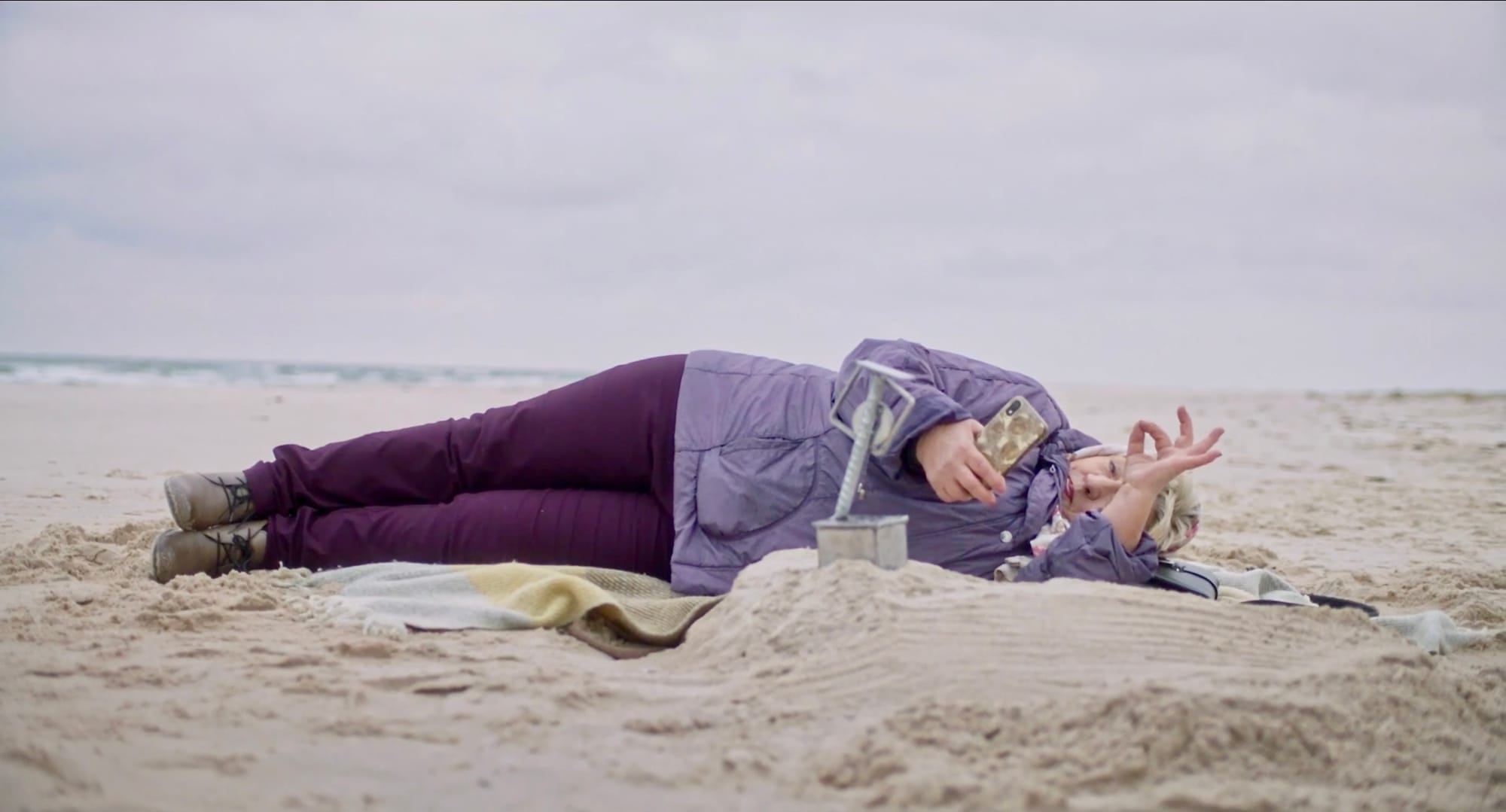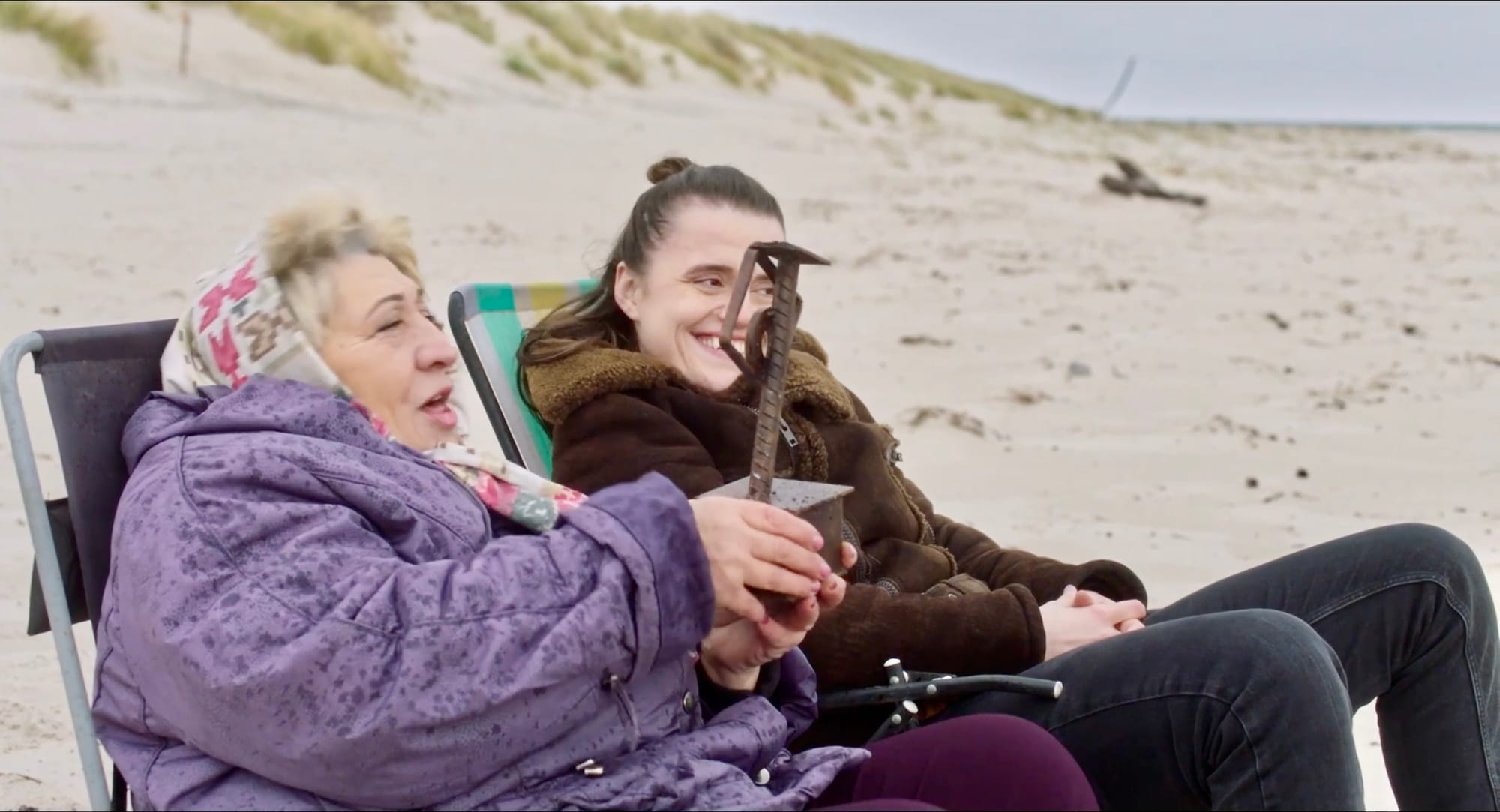 Jag skärmdumpade en sekvens för att visa på både seriens och karaktärernas ton. Här sitter mor och dotter på stranden efter att dottern tilldelats ett meningslöst fint Österlenspris, en liten statyett i rostig metall av en lokal konstsmed …