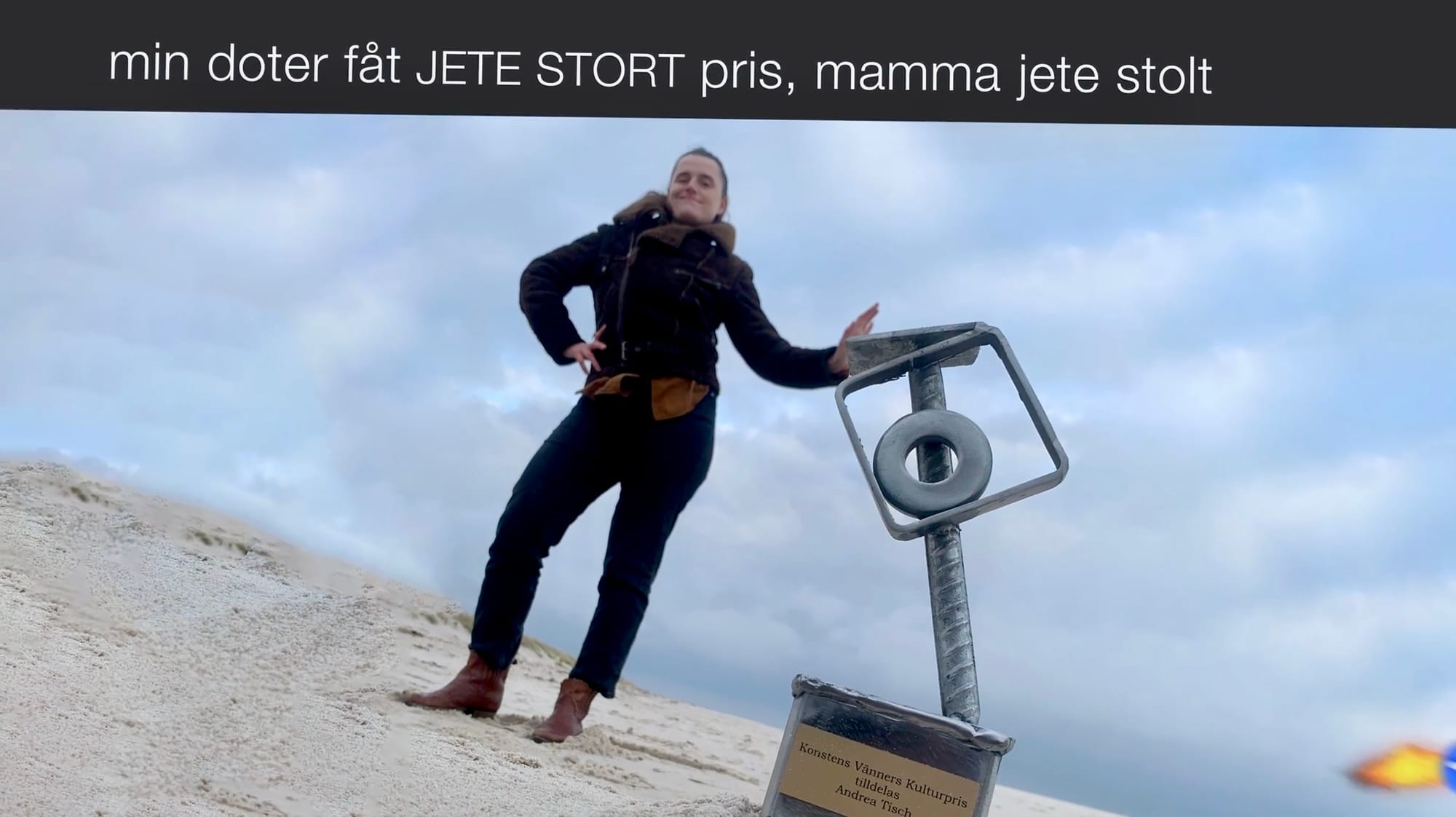 … och mamman är rätt dissande, tycker allt är skit med både Österlen och priset, »rost är bara rost … man kan ta bort med cola.« Och så får hon en idé, när hon håller upp statyetten och ser en liten figur där bakom …
