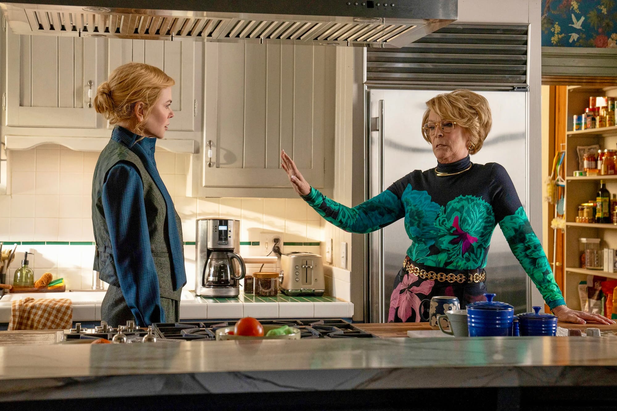 Vilket bäddar direkt för systerkonflikt. Nicole Kidman och Jamie Lee Curtis storgrälar om allt (första gången om texten till en gammal Michael Murphy-låt från 1975!) och iscensätter det som om regissörerna inte gjort annat än eldat på dem. Det blir både överdrivet och hudnära på en gång och känns enastående. Och eftersom Jamie Lee Curtis är ena (och vildaste) parten börjar jag snart associera till det där Cassavetes-doftande julavsnittet av The Bear … ja, det är faktiskt en träffande beskrivning så god som någon: Scarpetta är en fusion av The Bear-avsnittet Fishes och en klassisk kriminalserie från 1990-talet.
