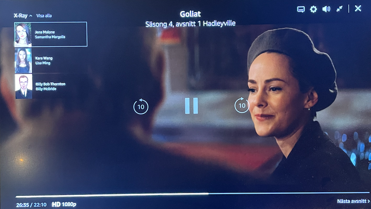 Amazons streamingtjänst Prime Video har en funktion de kallar »X-ray« – man bara för fjärren ut i kanten, medan man tittar, så dyker en transparent sidoflik upp med foton och namn på de skådespelare som syns i scenen som just utspelas. Och om det förekommer musik så anges även låt och artist i samma sidoflik.