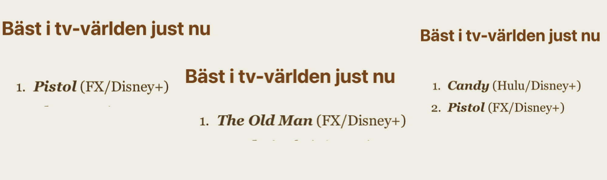 I tre av mina fyra senaste nyhetsbrev har jag hyllat Disney+-serier som »bäst i tv-världen just nu«. Men inte en enda av dem – varken Pistol, Candy eller The Old Man – finns på streamingtjänsten i Sverige. I stället får vi som toppserienyheter på svenska Disney+ denna vecka ytterligare episoder av »Ms. Obi-Marvel Kanobi«. Den enda nya serien de skakat fram är Have You Seen This Man? – årets tristaste true crime-doku.